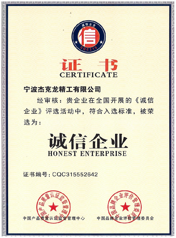 2018年11月8日,杰克龍精工公司正式獲得由浙江制造國(guó)際認(rèn)證聯(lián)盟和杭州漢德質(zhì)量認(rèn)證服務(wù)有限公司聯(lián)合簽發(fā)的《浙江制造認(rèn)證證書(shū)》。